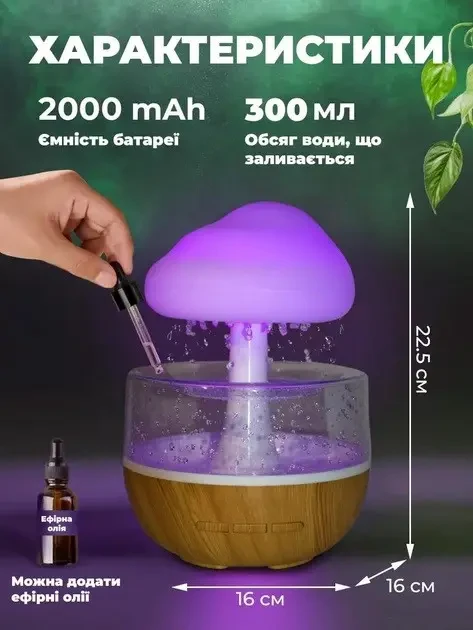 Зволожувач повітря у формі гриба з ефектом дощу та підсвічуванням - це корисний прилад для підтримання оптимальної вологості в приміщенні та стильний аксесуар, який додасть неповторного шарму вашому інтер'єру та допоможе створити атмосферу спокою й розслаблення.