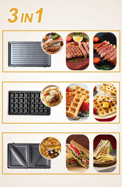 Сендвічниця 3 в 1 Crownberg 800W - це якісний пристрій, який дасть вам змогу приготувати велику кількість страв. Він поєднує в собі 3 кухонних прилади: мультигриль, сендвічницю і вафельницю. Це ви зможете зробити завдяки змінним формам, які йдуть у комплекті.