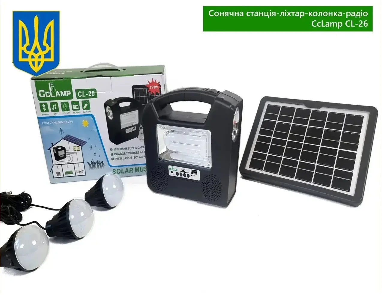 Нова модель популярної марки CcLamp CL-26 з елегантним дизайном постачається з FM-радіо, MP3-плеєром, Bluetooth-колонкою, трьома світильниками, набором перехідників і сонячною панеллю. Час повного заряджання від сонця 10-15 годин, вихід постійного струму 3.2 В для освітлення в разі вимкнення живлення.
